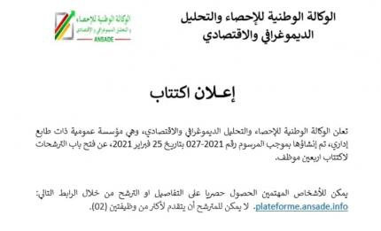 ووفق إعلان الإكتتاب، الذي قالت “الوكالة الوطنية للإحصاء والتحليل الديموغرافي والاقتصادي” ووصل “آراء انيوز”، “عن فتح باب الترشحات لاكتتاب اربعين موظف”، يمكن للأشخاص المهتمين الحصول حصريا على التفاصيل او الترشح من خلال الرابط التالي: plateforme.ansade.info