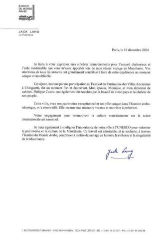 وجه السيد جاك لانغ، رئيس معهد العالم العربي بباريس، شكره العميق للسلطات الموريتانية على حفاوة الاستقبال والعناية الفائقة التي حظي بها خلال مشاركته بمهرجان مدائن التراث بشنقيط. معتبرا أن هذا الاستقبال المميز ساهم في جعل هذه التجربة “لحظة فريدة ولا تُنسى، تركت انطباعًا عميقًا” لديه ولدى الوفد المرافق له، وقد “تأثروا بشدة بجمال موريتانيا وأصالة شعبها”.