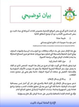 إثر الجدل الذي أثير في بعض المواقع الإخبارية بخصوص لقاءات أجريناها في ميناء تانيت مع بعض المستثمرين الأجانب، نود أن نوضح الحقائق التالية: