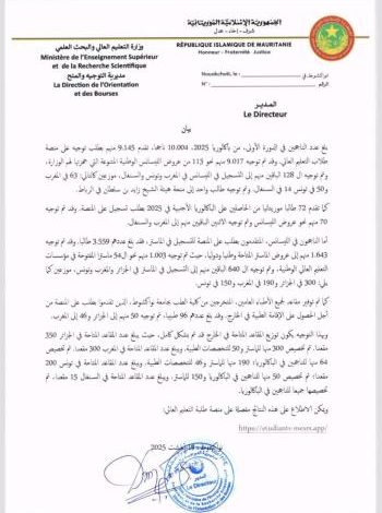 وأكدت الوزارة توفر مقاعد في الطب البشري بكلية الطب في نواكشوط، مع منح خارجية تشمل 96 طبيبًا (50 في الجزائر و46 في المغرب).