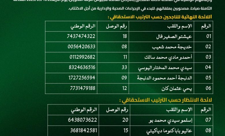 اللائحة النهائية للناجحين حسب الترتيب الاستحقاقي :