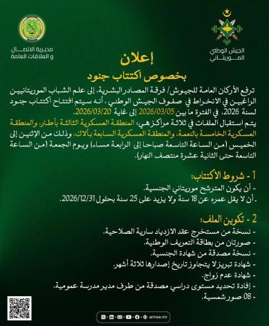 أعلن الجيش الوطني الموريتاني عن تنظيم مسابقة لاكتتاب جنود لصالحه خلال سنة 2026، موجهة إلى الشباب الموريتانيين الراغبين في الالتحاق بصفوف المؤسسة العسكرية.